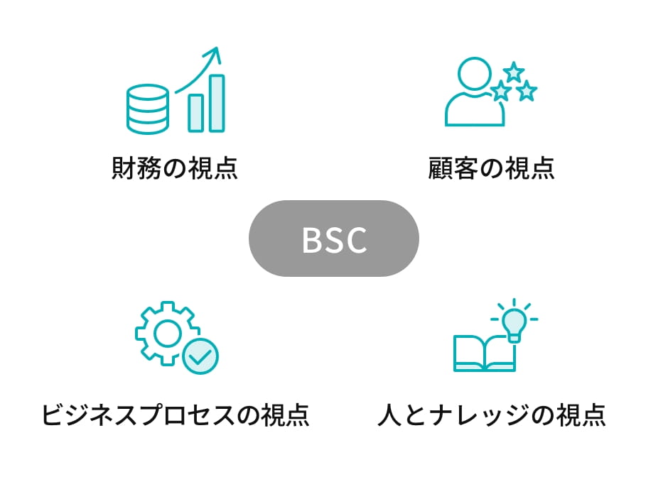 企業のビジョンと戦略を実行可能なアクションに落とし込み、企業の成長と競争力強化、そして将来の持続的な発展を目指すための戦略的マネジメントシステムです。「財務の視点」「顧客の視点」「ビジネスプロセスの視点」「人とナレッジの視点」の4つの視点で設定します。